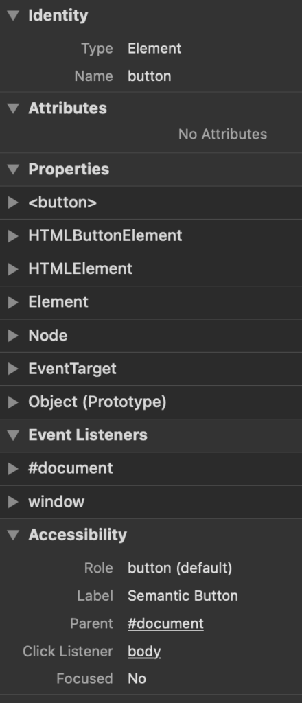 Anyway, that’s all I wanted to share. Using semantic elements where possible is one of those “best practice” statements we pick up along the way. I teach it to my students, but am guilty of relying on the high-level “it helps accessibility” reasoning that is just as generic as a <div>. Now I have specific talking points for explaining why that’s the case, as well as a “new-to-me” weapon in my DevTools arsenal to inspect and confirm those points.