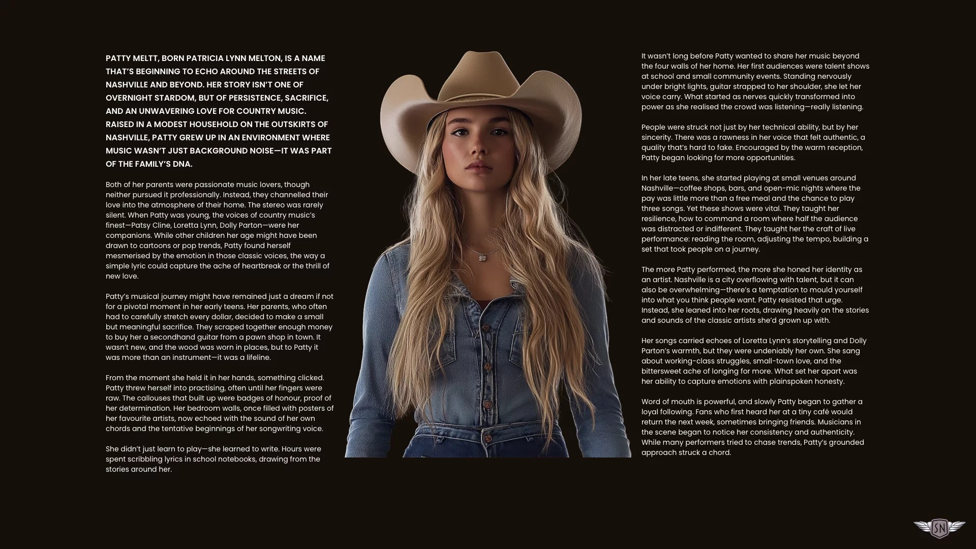 Patty Meltt likes to push the boundaries of country music, and I wanted to do the same with my design of her biography. I planned to flow text between two photomontages, where elements overlap and parts of the images spill out of their containers to create depth.