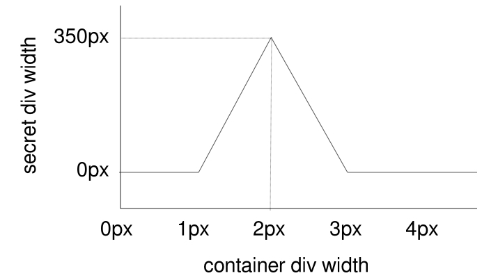 For the fun of it, let’s combine this tech with our previous secret message example. Instead of toggling the secret message’s width between the values of 0px and 350px, I’ve adjusted the calc formula so that the secret message div is normally 350px, and becomes 351px if the right combination is set.