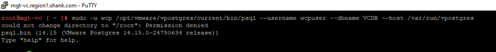 sudo -u wcp /opt/vmware/vpostgres/current/bin/psql --username wcpuser --dbname VCDB --host /var/run/vpostgres“
