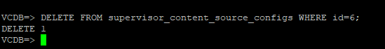 3. From the output find t he ID and run “DELETE FROM supervisor_content_source_configs WHERE id=6;” – Change the ID to suit your environment, it is from the first column in the select command.